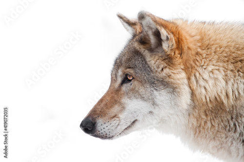 Big Morda Gray Red Wolf In Profile On White Snowy Background