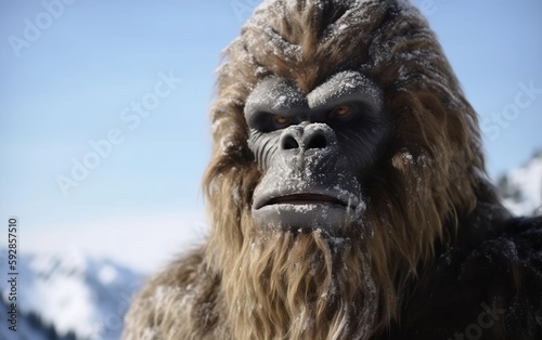 Bigfoot portrait on the snowy mountains background created with Generative AI technology.