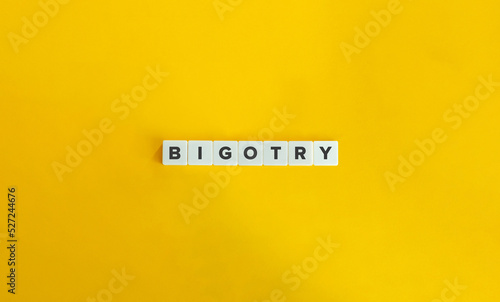 Bigotry Banner. Word on Letter Tiles on Yellow Background. Minimal Aesthetics.