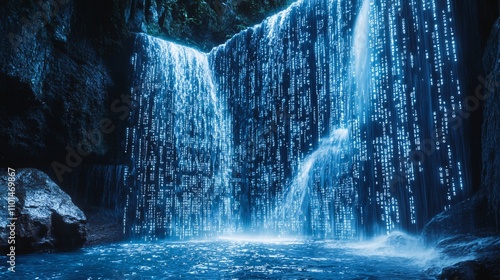 Binary code cascading in a waterfall with a glowing blue backdrop