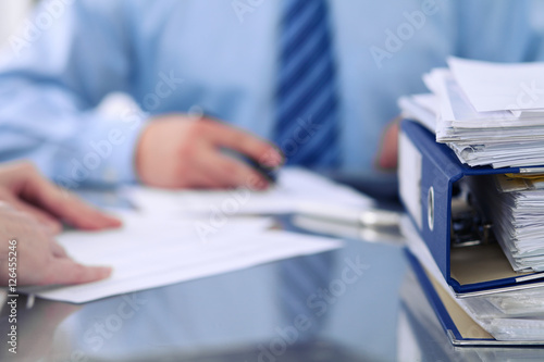 Binders with papers are waiting to be processed by bookkeepers back in blur. Accounting planning budget, audit, insurance and business concept