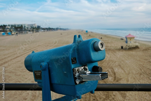 Binoculars telescope optics, tower viewer coin operated machine for touristic sightseeing beach. Lifeguard house, Huntington Beach Pier, background, Orange County. Blue color, evening cloudy sky
