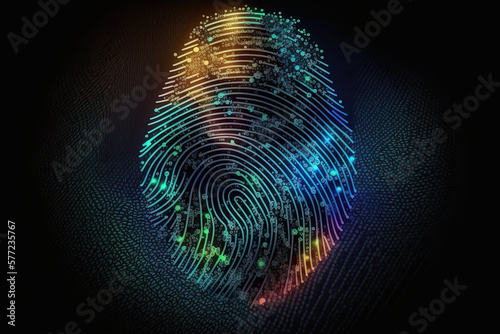 Biometrics identification and cyber security concept. Glowing neon fingerprint on a dark background, Generative AI,
