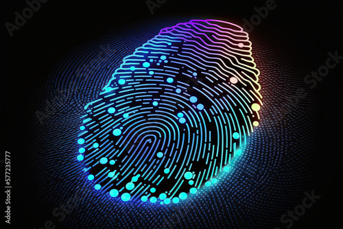 Biometrics identification and cyber security concept. Glowing neon fingerprint on a dark background, Generative AI,