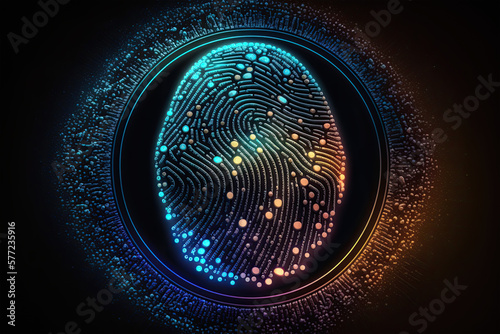 Biometrics identification and cyber security concept. Glowing neon fingerprint on a dark background, Generative AI,