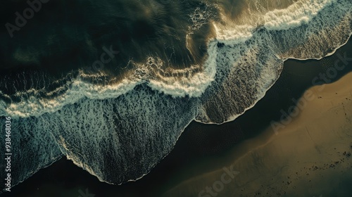 Bird's-eye view of a deserted beach with waves forming patterns on the sand, capturing the peaceful solitude of nature