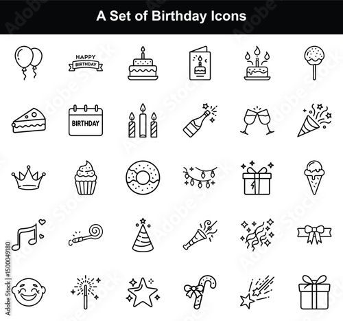 Birthday Icons Set with Cake, Candles, Gifts, Party Blower, Balloons and Sweets