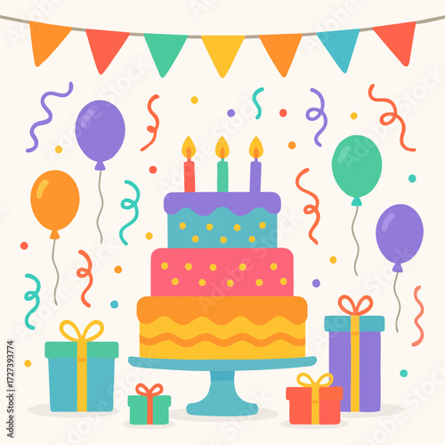 Birthday party cake with candles, bunting, streamers, and festive decorations.