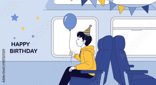 Birthday Travel Celebration Boy With Balloon In Train Minimalist Illustration