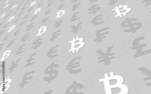 Bitcoin and currency on a gray background. Digital Cryptocurrency symbol. Business concept. Market Display. 3D illustration