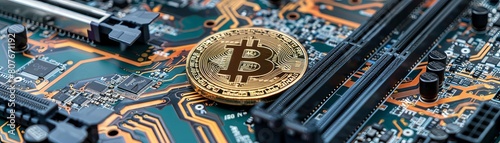 Bitcoin Cryptocurrency coin on a PC computer motherboard, crypto currency mining concept