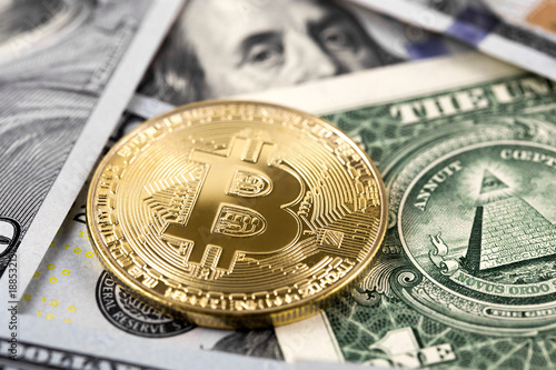 bitcoin on dollars close up