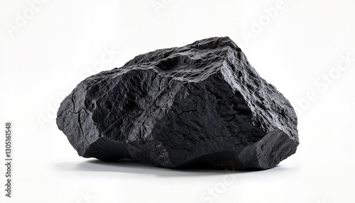 Bituminous coal lump highlighting texture on white backdrop, product photography