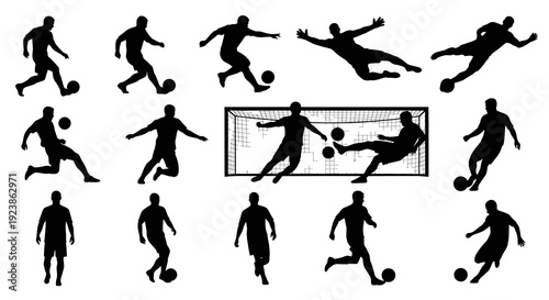 Black White Silhouette Vector Icons of Soccer Players in Action with Goal