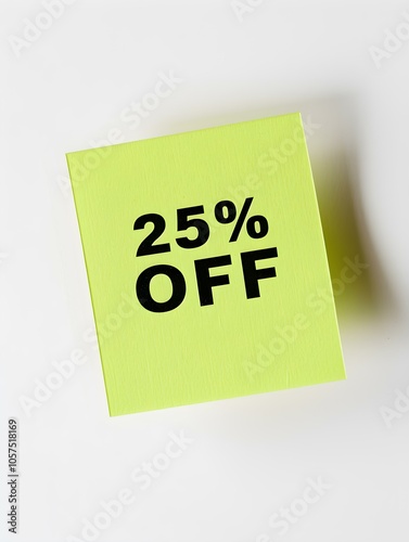 Black '25% OFF' Text on a Green Square Paper Note. White Background