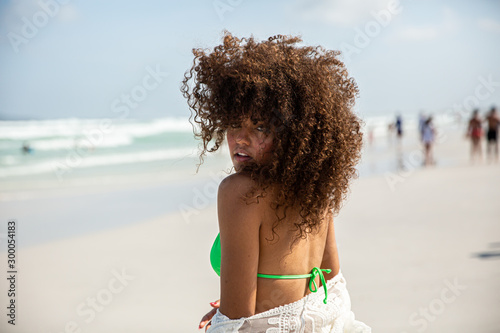 Black afro young cute girl, curly hair, bikini, beach. Afro American summer vacation holiday.