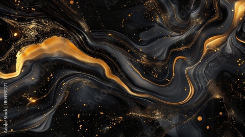 black and gold abstract wallpaper, flowing liquid shapes with shimmering particles, high resolution, intricate details, detailed background.