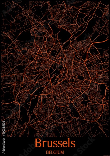 Black and orange halloween map of Brussels Belgium.This map contains geographic lines for main and secondary roads.