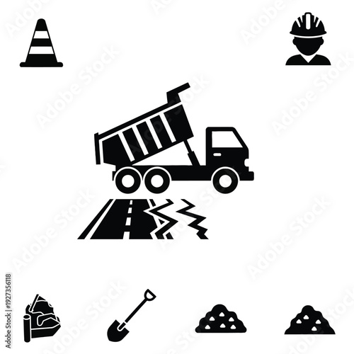 Black and white construction scene with dump truck, road damage, worker, and tools