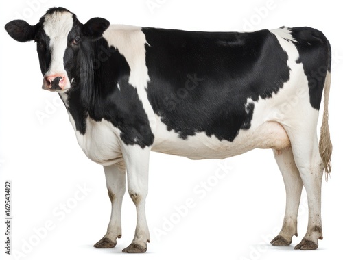 Black and white cow, standing against a white backdrop, facing left with a curious expression