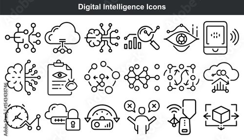 Black and White Digital Intelligence Icons Set Network Data Cloud Computing