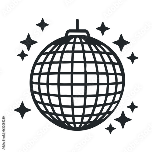 Black and white disco ball with sparkling stars icon