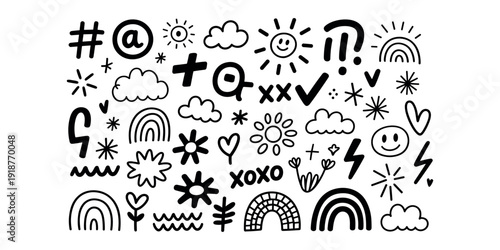 Black and white doodle including symbols and shapes clouds in white background.