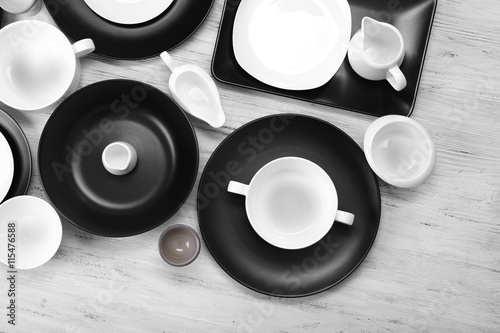 Black and white empty dishes on white wooden background.