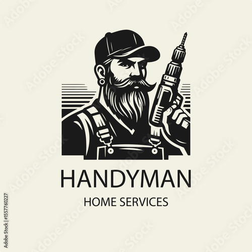 Black and white flat vector logo of Handyman home services. Bearded man in a cap holding a drill. Perfect for repair, construction, renovation, and handyman branding.