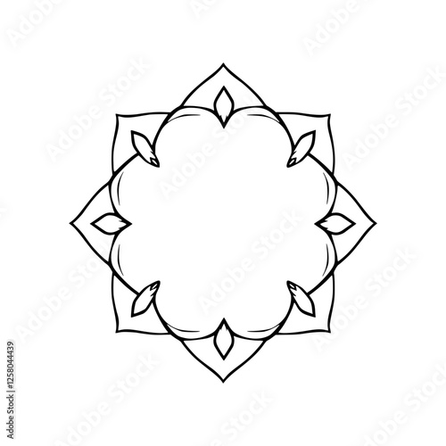 Black and white floral mandala-esque design in a simple, linear style.