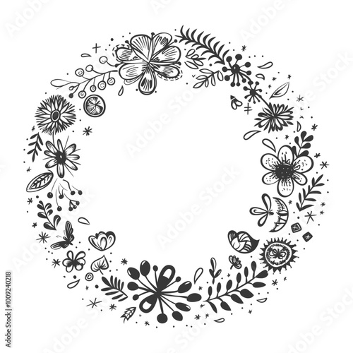 Black and White Floral Wreath with Small Details
