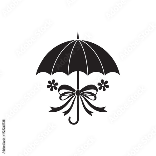 Black and White Icon Illustration of an Umbrella Decorated with Bow and Flowers.