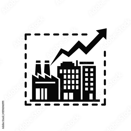 Black and white icon of a factory and buildings with an upward trend arrow