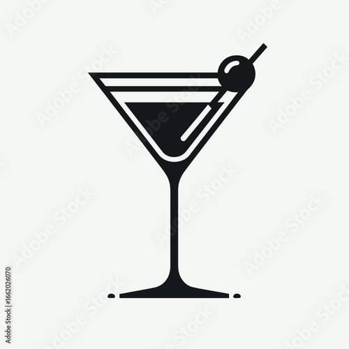 black and white illustration of a martini glass with an olive on a light background