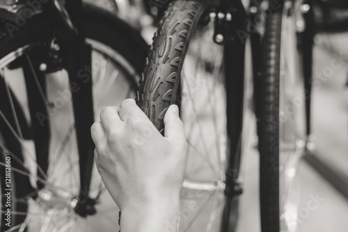 Black and white image close up on human hand checking bicycle tire