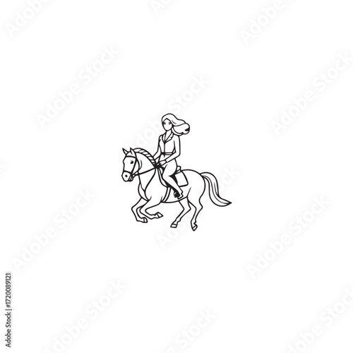 Black and white line art of a beautiful woman with perfect body riding horse elegant minimalist illustration