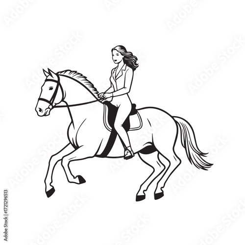 woman, horse, riding, equestrian, beautiful, body, elegant, stylish, outfit, vector, illustration, line art, black, white, drawing, vignetting, outline, silhouette, graceful, confident, minimal, minimalist, simple, chic, fashion, strong, female, rider, horseback, lifestyle, graphic, design, modern, artwork, aesthetic, decorative, posh, posture, athletic, feminine, contemporary, sport, leisure, stable, countryside, charming, equine, composition