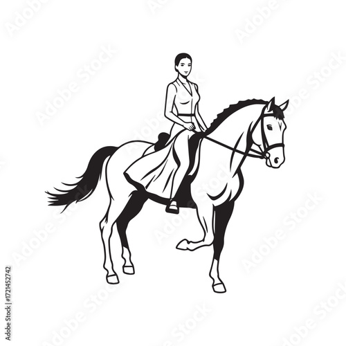 Black and white line art of a beautiful woman with perfect body riding horse elegant minimalist illustration