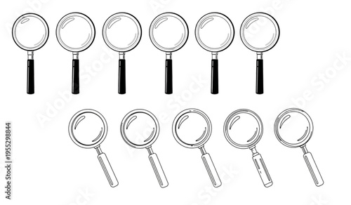 Black and white line art set of magnifying glasses in various styles for search and investigation themed design projects