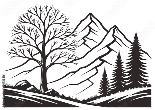 Black and White Mountain Landscape Illustration Bare Tree Coniferous Trees Rocks Hills vector
