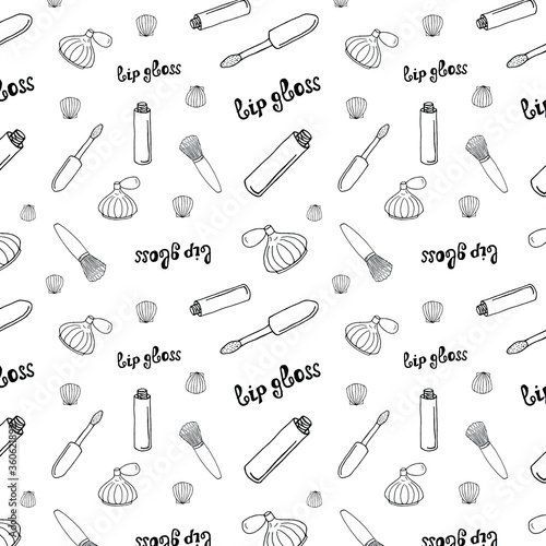 Black and white pattern with women cosmetics in doodle style. Perfume Lip gloss, Seashell, Bone powder. cosmetics and makeup seamless pattern in line art style. Design for textiles, scrapbooking, ,