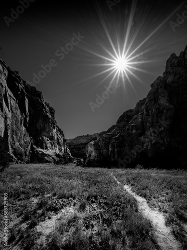 Black and white Photo of the sun setting over the Capitol Gorge Trail in Capitol Reef National Park, Utah, USA