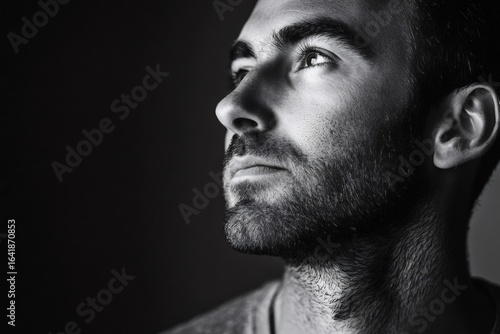 Black and white portrait of a bearded man looking up, featuring minimalist style and copy space