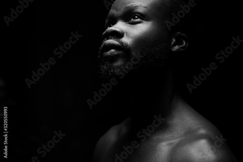black and white portrait of a handsome black man with naked sports torso looking in the left on dark background
