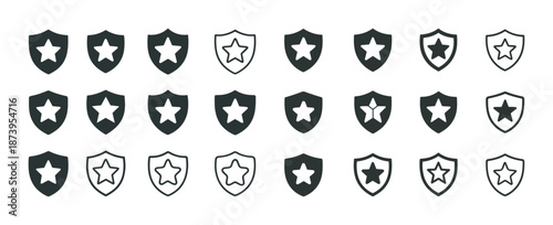 Black and white shield icon set with star designs in various styles
