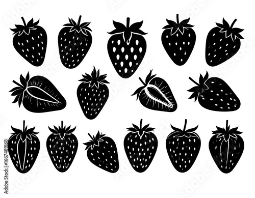 Black and white silhouette illustration of various strawberries