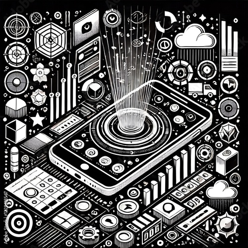 Black and white vector illustration of a smartphone with various digital icons and elements