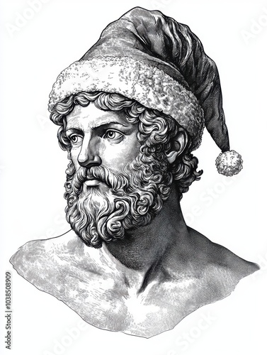 Black and white Vintage engraved art of Hermes wearing a Christmas Santa hat, isolated on white background, ink sketch illustration, simple vector art design, highly detailed line art, high contrasty