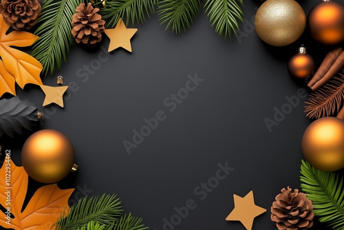 Black background with a gold border gold star in the middle. festive Christmas frame, gold ornaments, pine branches, dark background, elegant holiday decor, stars and pinecones, blank central space