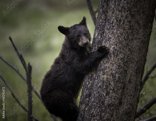 Black bear cub climbing tree in forest